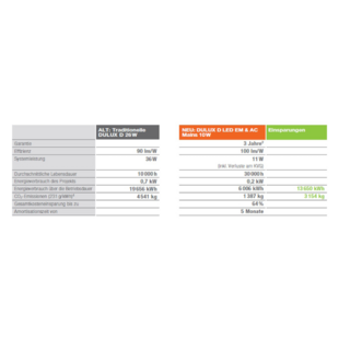 Die LEDVANCE DULUX® LED können mit ihrer sofortigen Energieeinsparung die Betriebskosten senken. Und das übrigens gleich zweifach: Ihre lange Lebensdauer von 30.000 Stunden steigert die Wirtschaftlichkeit weiter und sorgt zudem für eine schnelle Amortisation der Wechselkosten.